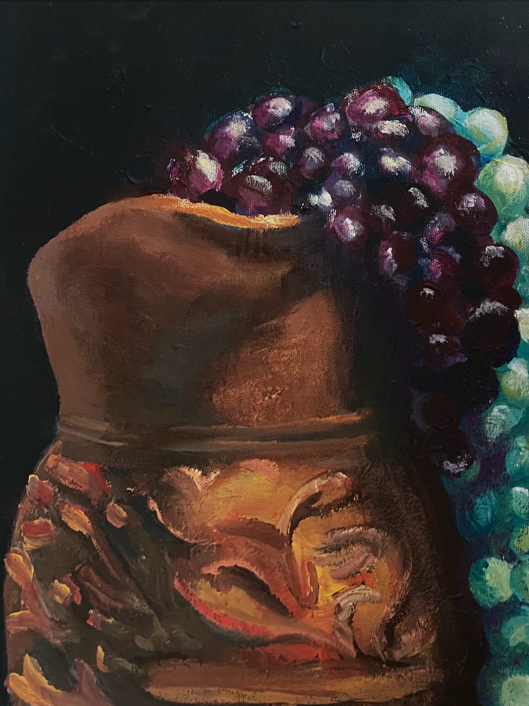 I created an acrylic painting of a still life featuring a vase filled with grapes. Using warm tones to establish ambiance, I focused on blending techniques to enhance depth. I mirrored the high-contrast elements through dynamic color choices and varied brush strokes, capturing the vibrant textures and shapes of the composition.