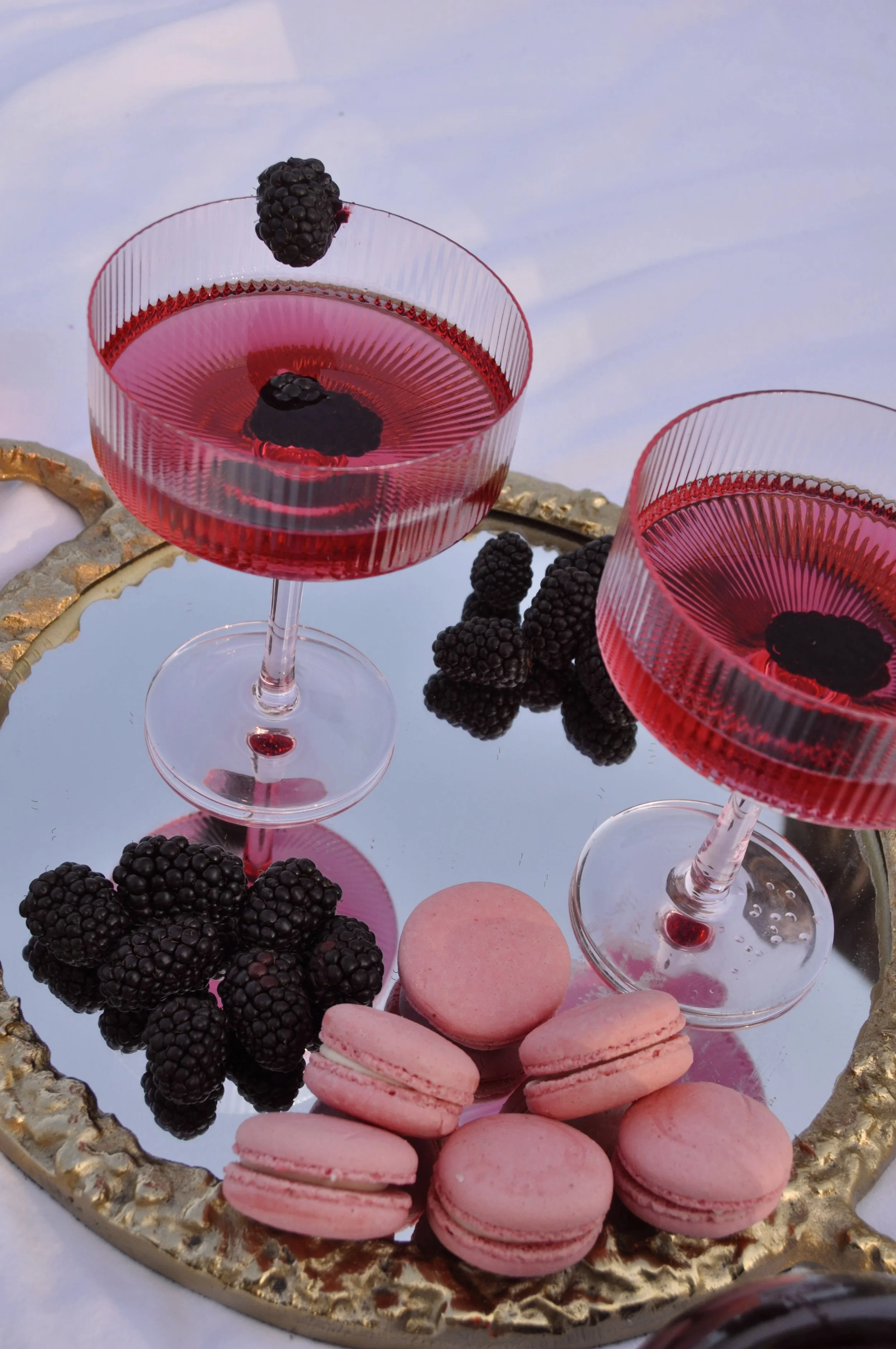 Props: Chambord, cocktail glasses, black berries, macaroons, board, and picnic blanket.